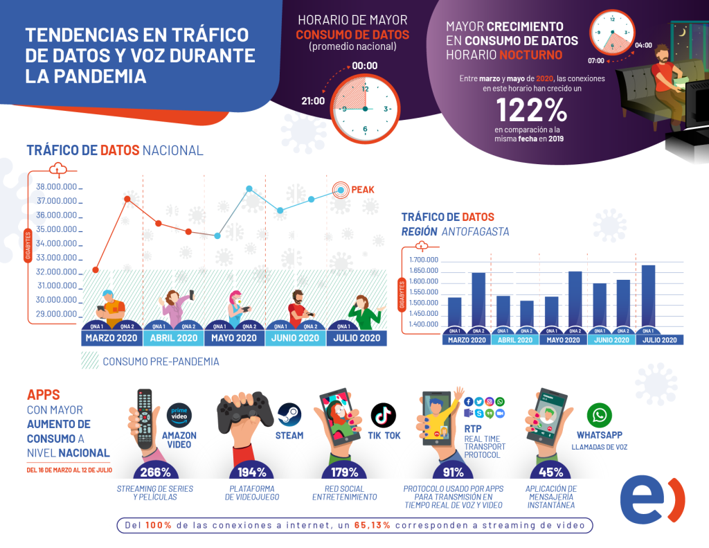 Según el tercer análisis hecho por la empresa de tecnología y telecomunicaciones Entel, durante la emergencia sanitaria, en la primera quincena de marzo se traficaron datos móviles por 1.538.891 gigabytes (GB) en la Región de Antofagasta, que se comparan con los 1.686.093 GB registrados en la primera quincena de julio, lo que equivale a un incremento de 9,5%, y se consolida además como el período con mayor consumo de datos móviles en la región desde que comenzó la emergencia sanitaria. El peak anterior se había observado la segunda quincena de mayo.
