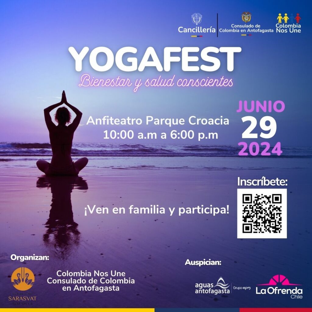 Todos los años en el mes de junio se celebra el Día Internacional del Yoga, y este 2024 la organización Sarasvat Gaudiya y el Consulado de Colombia en Antofagasta a través del programa Colombia Nos Une, han organizado el YogaFest, una actividad para toda la familia que busca generar un espacio para el bienestar físico y mental.