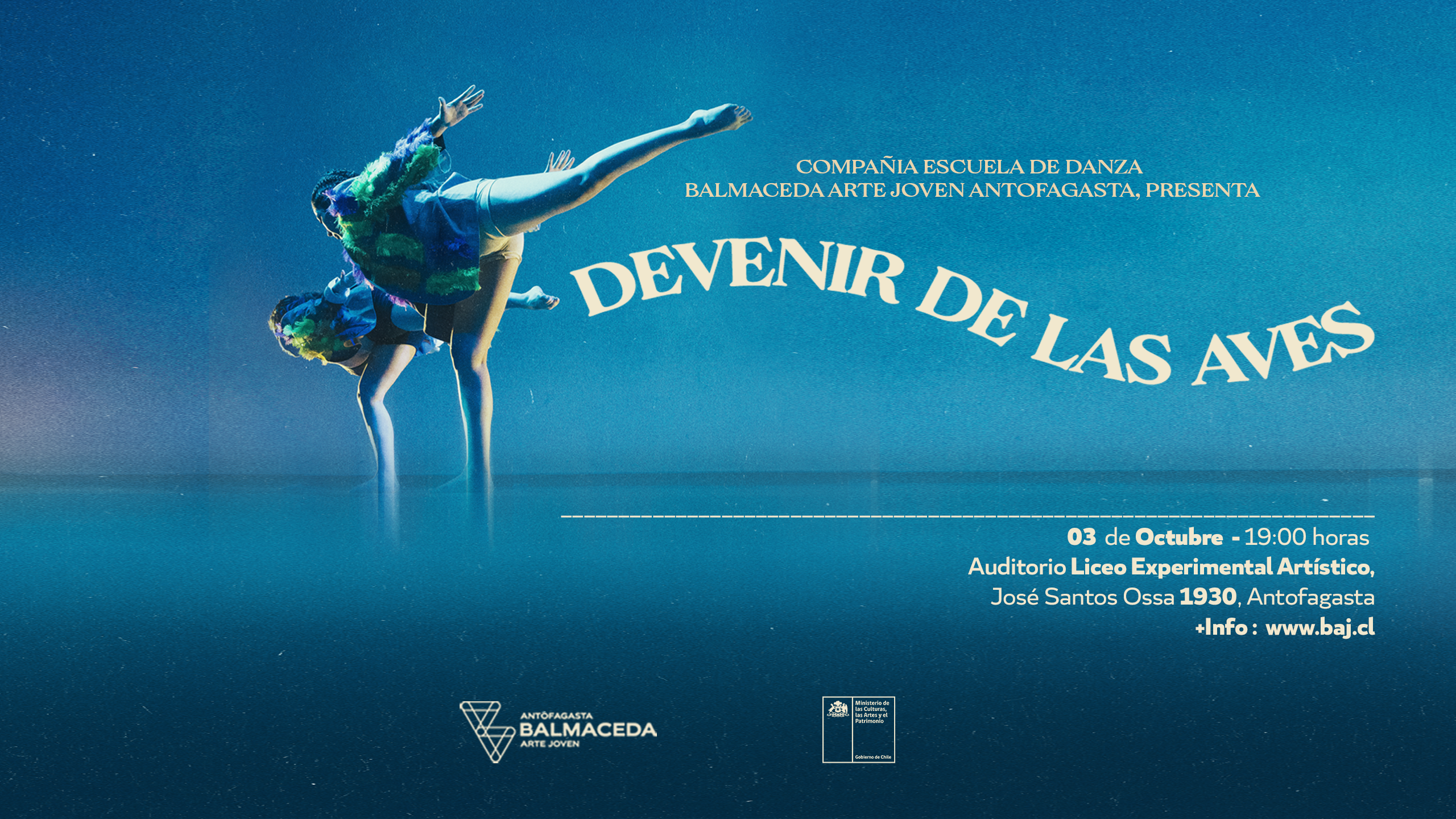 La Compañía Escuela de Danza Balmaceda Arte Joven, le invita al reestreno de su montaje de danza contemporánea denominado “El Devenir de las Aves”, el que se presentará en una única función, a realizarse este viernes 03 de octubre, a las 19:00 horas, en el auditorio del Liceo Experimental Artístico, ubicado en José Santos Ossa 1930, Antofagasta.